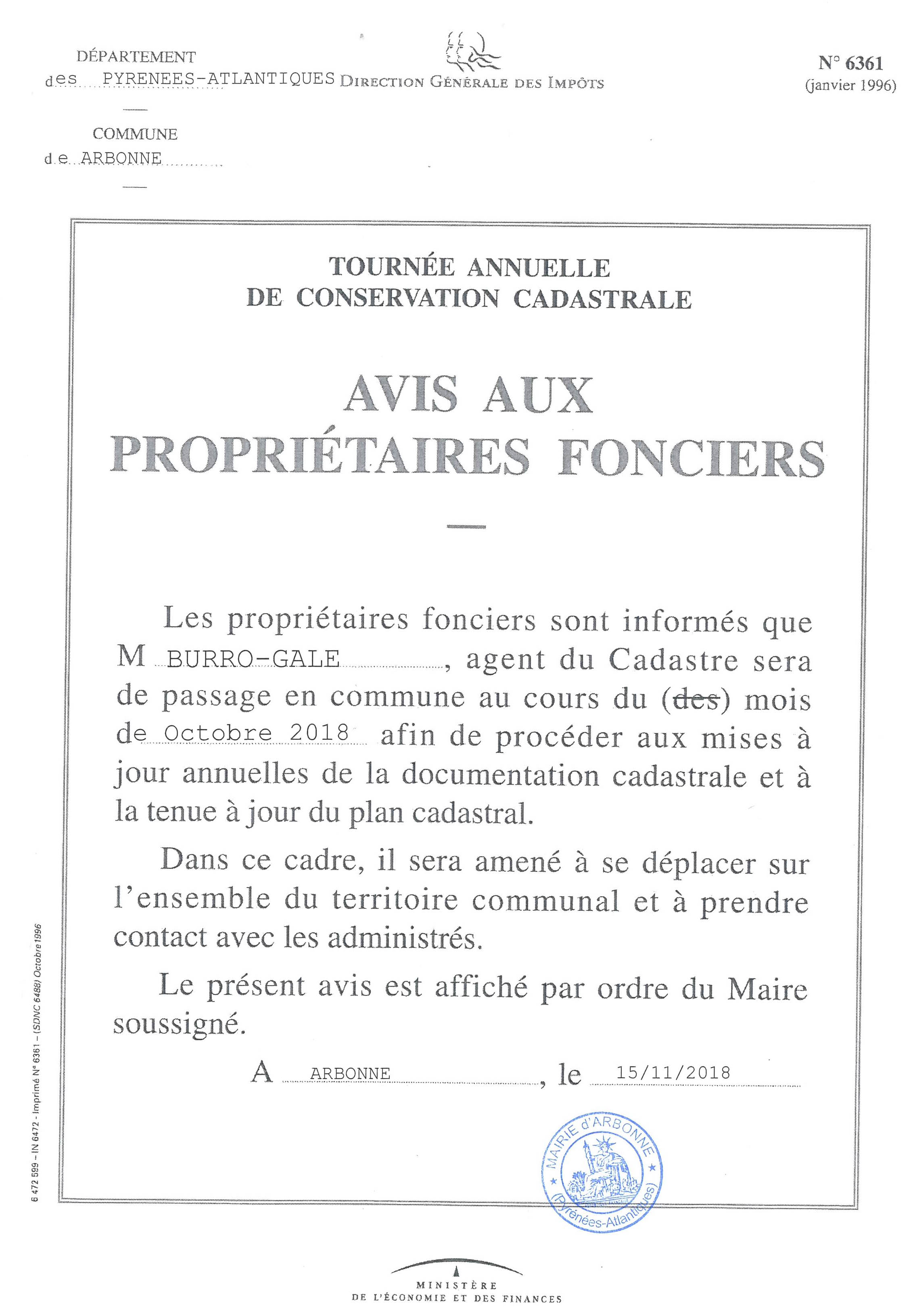 AVIS DE PASSAGE AGENT DU CADASTRE