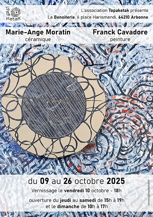 Marie-Ange Moratin (céramiste) et Franck Cavadore (peintre), nous invitent à découvrir leur univers et le dialogue fructueux qui s’instaure entre eux, du 9 au 26 octobre 2025.