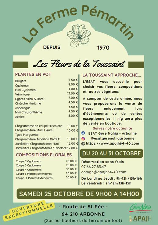 L’atelier horticulture de la Ferme Pémartin de l’ESAT, vous propose de jolies fleurs pour cette Toussaint 2025.